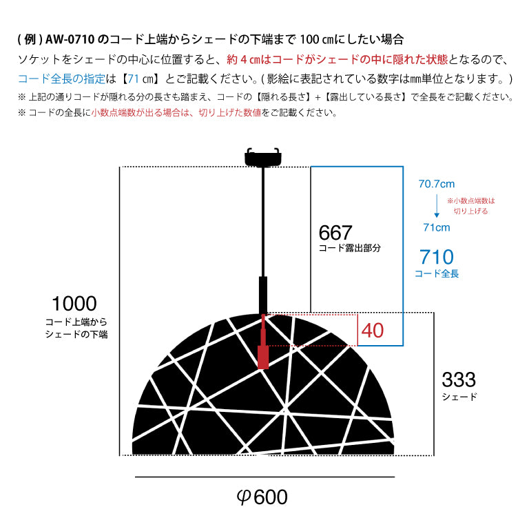 ※コード上端からシェードの下端までを100cmにしたい場合は、ソケットをシェードの中心に位置すると、約4cmはコードがシェードの中に隠れた状態となるので、コード全長は70.7cmとなります。小数点がある場合は切り上げて【71cm】とご記載ください。